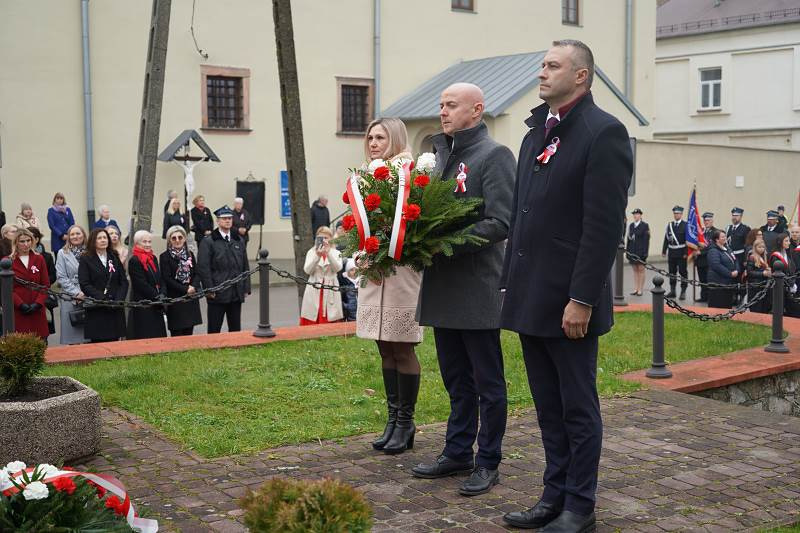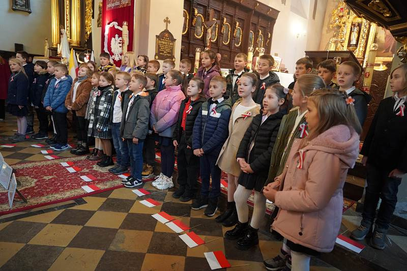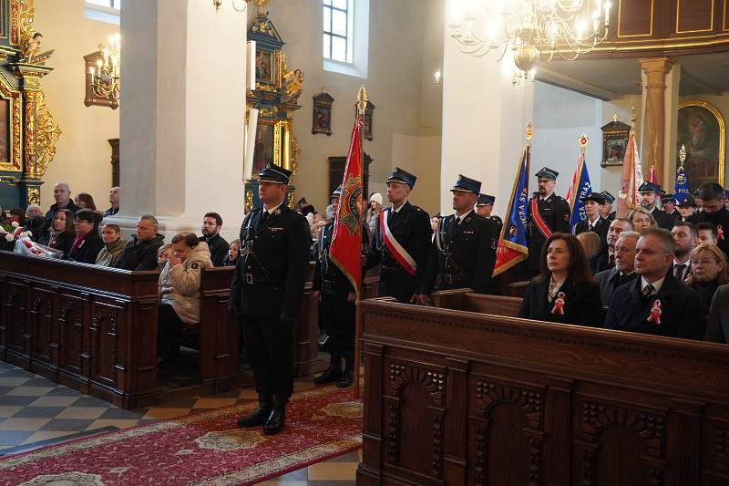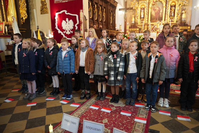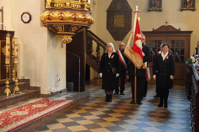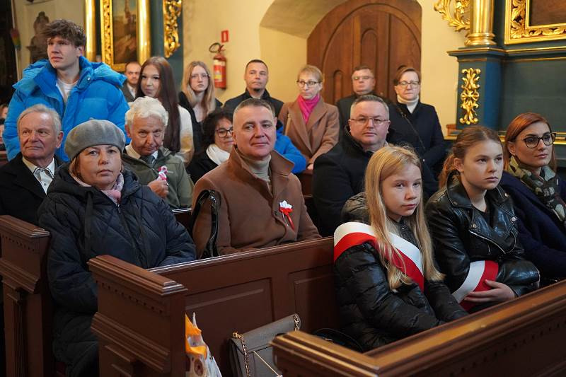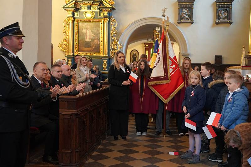 Po oficjalnym powitaniu i złożeniu podziękowań przez burmistrza uczestnicy wzięli udział wuroczystej Mszy Świętej, odprawionej w intencji Ojczyzny pod przewodnictwem ks. proboszcza, dziekana Jana Kukowskiego. W swojej homilii kapłan również podkreślił znaczenie dzisiejszego dnia, przypominając, że Święto Niepodległości to nie tylko czas radości, ale także refleksji nad odpowiedzialnością za przyszłość kraju. Zachęcał wiernych do pielęgnowania wiary, patriotyzmu i szacunku dla drugiego człowieka jako wartości, które budują silną wspólnotę narodową.