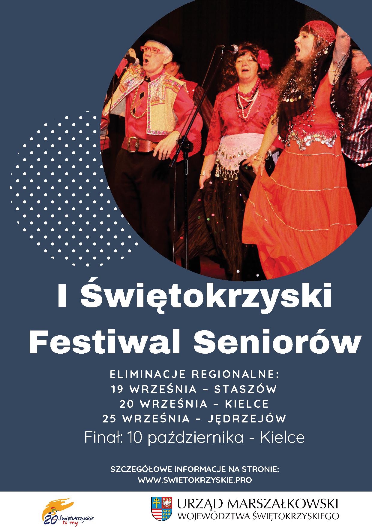 Urząd Marszałkowski Województwa Świętokrzyskiego - Biuro Komunikacji Społecznej serdecznie zaprasza seniorów, którzy chcą zaprezentować na scenie swoje umiejętności: wokalne, taneczne, teatralne, kabaretowe czy literackie, do udziału w I Świętokrzyskim Festiwalu Seniorów. Finał wydarzenia odbędzie się 10 października w Wojewódzkim Domu Kultury w Kielcach, poprzedzą go eliminacje regionalne w Staszowie, Jędrzejowie i Kielcach.