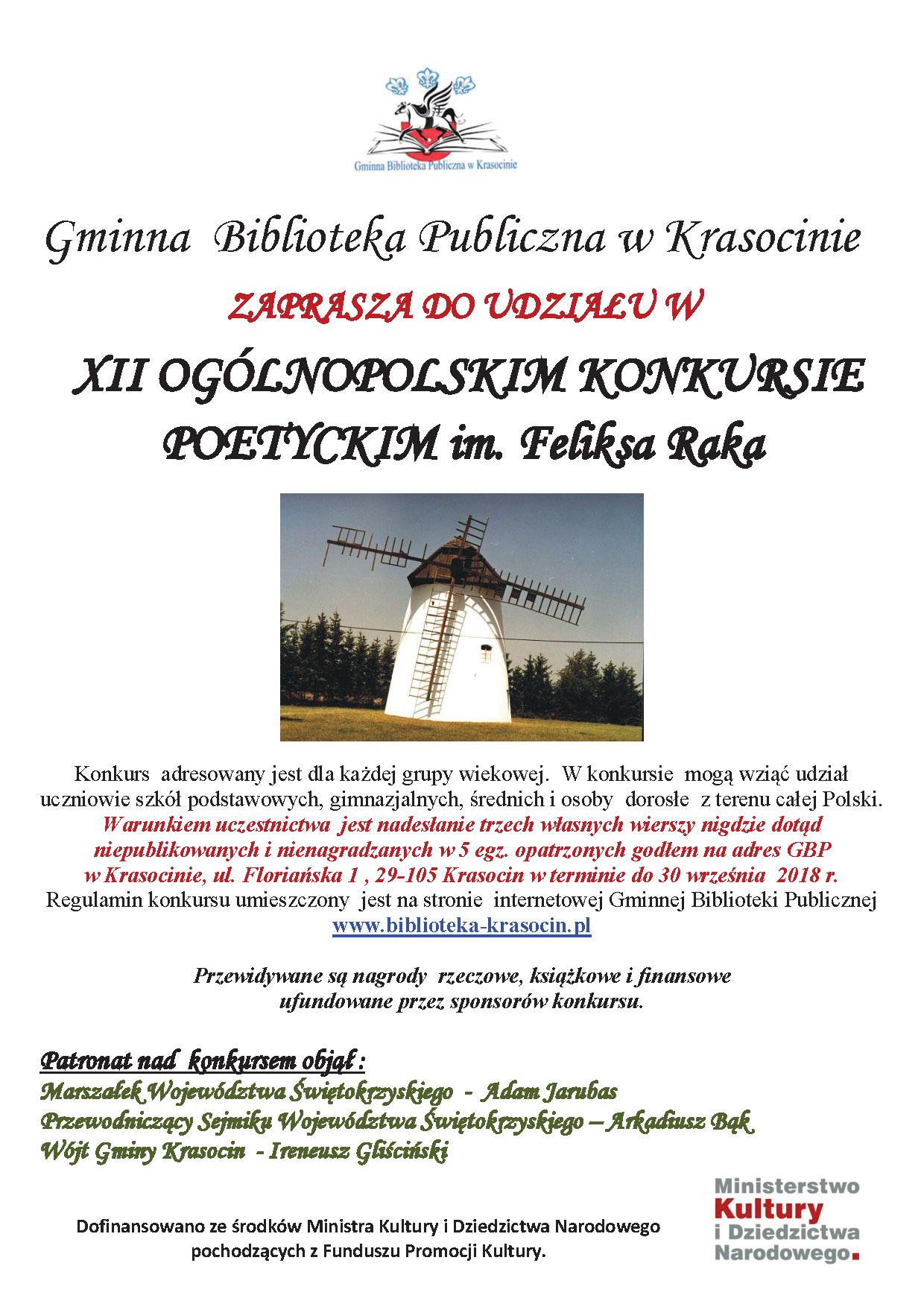 Gminna Biblioteka Publiczna w Krasocinie zaprasza do wzięcia udziału w XII Ogólnopolskim Konkursie Poetyckim im. Feliksa Raka. W konkursie mogą wziąć udział uczniowie szkół podstawowych, gimnazjalnych, ponadgimnazjalnych i osoby dorosłe z terenu całej Polski.